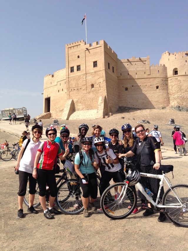 In February, Princeton FreeWheeler member, Caroline Argento Spoeneman and 122 other women with 17 different nationalities, biked through all seven of the United Arab Emirates (UAE). This oil-rich kingdom sits on the Persian Gulf between Oman, Saudi Arabia, and Qatar. The ride was the 6th annual for the UK-based international women’s non-profit, Follow the Women, sponsored this year by the UAE Cycling Federation in support of Palestinian refugees.