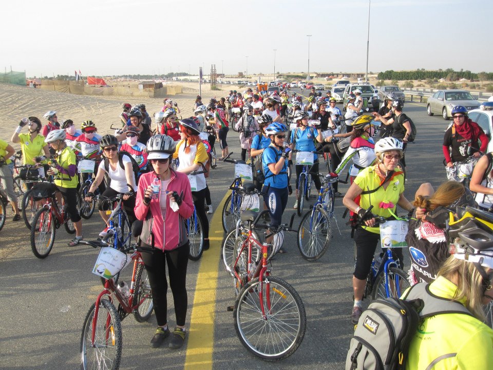 The riders were given mountain bikes but only a very few sections along the way were not paved. The terrain was generally flat, routes covering between 40 and 50 km a day in pleasant 70 degree Fahrenheit temperatures. The eight days began on February 16 in Dubai, with the bizarre shaped skyscrapers gleaming across the water in the distance. The bikers explored additionally: Fujairah, Ras al-Khaimah, Ajman, Umm al-Quwain, Abu Dhabi, and Sharjah. Along the routes they stopped at numerous museums, schools, women's centres, a spa, and two zoos. In Ras at an English School, a band played dressed in Scottish kilts, including bag-pipes, then the students performed in local costumes. At one school boys danced with play swords which they lay down in a gesture of peace. Shortly afterwards, when back cycling, the doors of the helicopter above opened and hundreds of long-stemmed roses flew down to decorate the bikes.